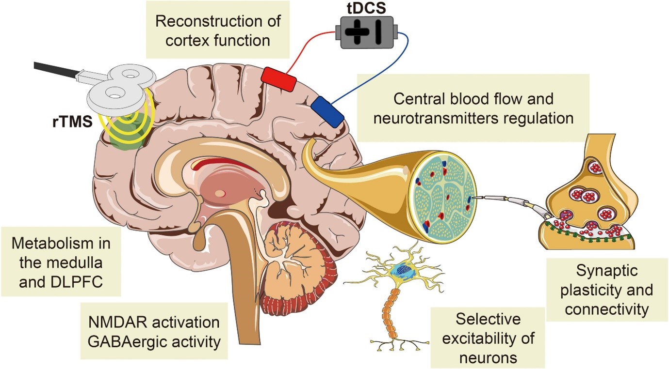 중추성 신경병통증은 척수나 뇌의 병변 혹은 질환에 의해 발생하며, 일반적으로 척수손상, 뇌졸중, 다발경화증 및 파킨슨병과 연관되어 나타난다. 중추성 신경병통증을 가진 환자는 오랜 기간 만성적인 통증을 경험하며, 이로 인해 삶의 질에 크게 영향을 받는다. 비침습적 뇌자극 치료법은 피질 흥분성과 신경가소성을 조절하며, 다양한 원인의 뇌 기능 부전에 대한 하나의 치료 옵션으로써 각광을 받아왔다. 약물치료에 비교적 제한이 있는 중추성 신경병통증에도 이러한 비침습적 뇌자극 치료가 적용되고 있으며, 대표적인 두 가지 뇌자극 방법으로는 1) 반복두개경유자기자극(repetitive transcranial magnetic stimulation, rTMS)과 2) 경두개직류전기자극(transcranial direct-current stimulation, tDCS)이 있다.