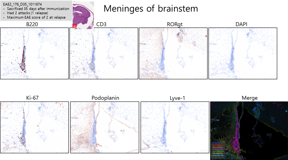 그림 1. EAE 모델의 brainstem에서 B cell predominant한 lymphocyte aggregation을 관찰할 수 있었으며 일부 Ki-67 및 RORgt염색 양성인 세포를 확인.