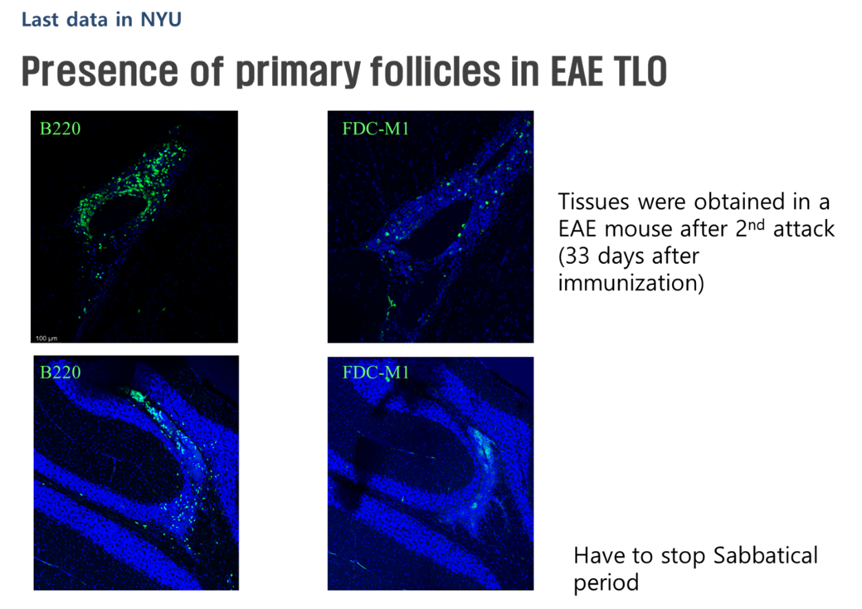 NYU에서는 Experimental Autoimmune Encephalomyelitis (EAE)모델를 이용하여 다발성 경화증 동물 모델을 만들고 이 동물 모델에서 meninges 에 존재하는 tertiary lymphoid organ (TLO)의 역할을 규명하는 연구를 수행하였습니다. 다발성경화증 환자들은 질병 발생 후 평균 15년- 20년이 지나면 재발이 없이도 증상이 지속적으로 악화되는 이차진행성(secondary progressive course) 경과를 겪게 됩니다. 다만 한번 이차진행성 경과로 이환이 되는 환자들은 기존의 치료제에도 잘 치료가 되지 않는 경향이 있는데 최근의 연구 결과에서는 이러한 이차진행성 악화의 원인이 환자들의 뇌수막(meninges)에 염증세포들이 군집을 이룬 후 3차림프기관(tertiary lymphoid organ, TLO)을 형성하여 적극적인 면역 반을을 일으킨다고 밝힌바 있습니다. 다만 이러한 TLO의 형성 원인과 정확한 기전에 대해서는 아직 충분한 연구 결과가 부족하여 향후 연구가 필요한 분야라 생각하게 되어 이를 진행하였습니다.