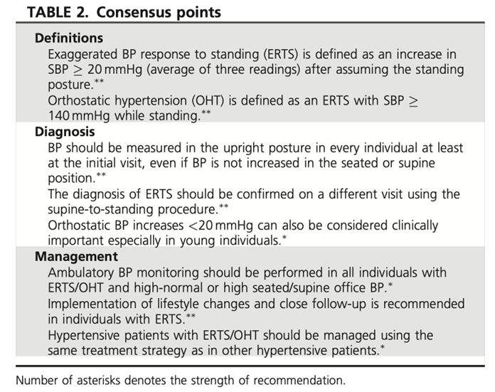 기존 고혈압 지침(예: 2018년 ESH 가이드라인)에서는 기립 시 혈압 측정이 주로 기립성 저혈압을 배제하기 위한 목적으로 고령 환자나 당뇨병, 자율신경계 이상이 있는 환자, 항고혈압제를 복용 중인 환자 등에 제한적으로 권고되었다. 그러나 최근에는 기립 시 혈압이 과도하게 상승하는 현상(ERTS, exaggerated blood pressure response to standing)이 젊은 층과 노년층 모두에서 심혈관 위험을 증가시킨다는 연구 증거가 축적되었다. 이에 2023년 ESH 고혈압 지침에서는 기립성 고혈압(OHT, orthostatic hypertension)을 새로운 고혈압 표현형의 하나로 포함하여, 고혈압 환자 평가 시 기립 상태 혈압 측정의 임상적 가치를 공식적으로 인정하였다. 그러나, 기립 시 혈압변화에 대한 연구들마다 측정 방법과 정의에 일관성이 없어서 실제 임상적·예후적 중요성을 가늠하기 어려운 한계점이 있었다. 또한, 연구들마다 정의를 달리하여 ERTS와 OHT를 혼용하거나, OHT를 단순히 기립 시 혈압 수치로 정의하기도 했으며, 또 어떤 경우에는 수축기 혈압(SBP) 위주로 기준을 삼고 일부는 이완기 혈압(DBP)까지 포함하는 등 진단 기준의 일관성이 결여 되어있었다. 이러한 배경에서 2022년 American Autonomic Society (AAS) 와 Japanese Society of Hypertension (JSH)에서 Consensus Statement를 발표한 것에 이어, 2024년 European Society of Hypertension (ESH) 산하 혈압 모니터링 및 심혈관 변동성 워킹그룹은 ERTS와 OHT에 대한 Consensus statement를 발표하였다. 본 리뷰에서는 2024년 ESH Consensus Statement 의 내용과 의미에 대해서 살펴보고자 한다. ESH Consensus Statement의 목적은 ERTS/OHT와 각종 불량한 임상 결과 간의 연관성에 대한 기존 연구 근거를 재검토하고, RTS의 표준화된 평가 방법을 제시하며, ERTS와 OHT의 통일된 정의 기준을 논의하고, ERTS/OHT 환자의 평가와 관리를 위한 권고사항을 제안하는 데 있었다. 특히 좌위 혈압이 정상인 상태에서 기립시 고혈압을 보이는 환자와, 원래 고혈압 환자이면서 추가로 ERTS/OHT를 보이는 환자의 두 부류를 구분하여 접근할 필요성을 언급하고 있다.