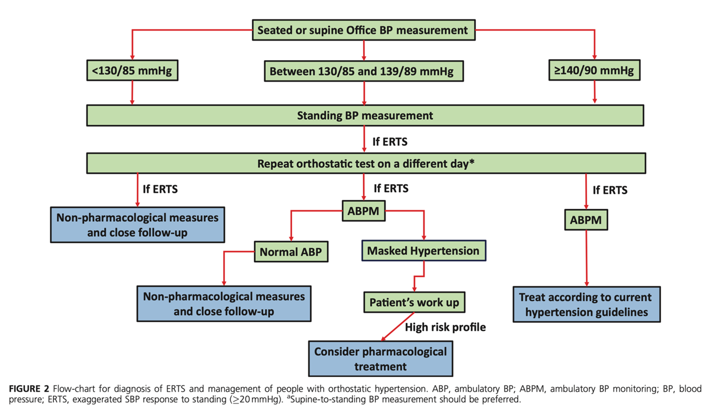 3) 진단 방법 및 ABPM과의 연관성: 현재까지 ERTS/OHT를 평가하는 혈압측정 방법에 대해 합의된 지침은 없으나, 이번 합의문은 정확한 평가와 연구 간 비교를 위해 표준화된 측정법을 권고한다. 2023년 ESH 지침에서는 첫 내원 시 그리고 위험도가 높은 환자에서는 앉은 자세에서 일어난 후 1분 및 3분에 기립 혈압을 측정하도록 권장하였는데, 본 합의문에서도 이와 맥락을 같이한다. 즉, 앉거나 누운 상태에서 3~5분 안정 후 가능한 한 빨리 일어서서, 일어서고 1분째와 3분째에 각각 혈압을 측정하도록 하고, 연구목적 등으로는 1분 간격으로 세 차례 측정하여 평균을 내는 것이 바람직하다고 제안한다. 측정 전에는 최소 30분간 흡연이나 카페인 섭취, 운동을 피하며 조용하고 쾌적한 환경을 유지하고, 측정 중 환자와 의료진 모두 말을 하지 않도록 한다. 또한 몸과 팔의 자세가 중요한데, 서 있을 때 팔을 아래로 늘어뜨린 상태로 측정하면 심장 높이에서 잰 것보다 혈압이 높게 나오는 경향이 있어, 누워있을 때, 앉아있을 때, 서 있을 때 항상 커프의 중심이 심장 높이에 위치하도록 팔을 지지한 상태로 측정하는 것이 필요하다. 기존 연구들에서는 기립 시 팔 위치에 대한 기술이 일관되지 않았으나, 일부 데이터에서 팔을 내렸을 때 혈압이 과대측정되는 차이가 확인된 바 있다. ERTS/OHT 소견이 한 번이라도 관찰되면, 생리적 변동 범위 내의 일시적 현상인지 아니면 지속적 패턴인지를 확인하기 위해 다른 날 재측정이 권고된다. 기립 혈압 반응은 재현성이 다소 제한적(중등도 또는 그 이하)으로, 최소 두 번의 다른 방문에서 모두 일관되게 나타날 때 비로소 예후적 의미가 뚜렷해진다는 보고가 있다. 따라서 1차 검사에서 ERTS/OHT가 의심되면 재방문 시 누운 자세에서 일어서는 기립검사로 한 번 더 확인할 것을 제안한다. 일상 생활 중 혈압 양상을 평가하기 위해 주기적인 24시간 활동혈압 모니터링(ABPM)의 활용이 강조되는데, 특히 진료실 혈압이 정상 상한이거나 경계역인 환자에서 ERTS/OHT가 발견되면 가면고혈압 여부를 확인하기 위해 ABPM을 실시하는 것이 권장된다. 실제로 한 연구에서는 24시간 평균 혈압으로 정의한 고혈압을 예측하는 데 있어 앉은 자세 혈압보다 선 자세 혈압의 진단 정확도가 더 높았다. 젊은 성인 군에서는 기립 시 SBP 및 DBP 상승폭이 큰 사람이 활동 중 평균혈압이 유의하게 높다는 보고도 있다. 또한 여러 연구에서 ERTS 소견이 있는 사람은 그렇지 않은 사람보다 가면고혈압을 보유하고 있을 확률이 높다는 것이 확인되었다. 예를 들어, 젊은 성인군인 HARVEST 연구에서 기립 시 SBP 상승이 가장 큰 상위 10% 군은 추적 관찰 시 가면고혈압 발생 위험이 약 2.45배에 달했다. 이러한 결과들을 종합하면, 기립 시 혈압 반응 검사는 진료실 혈압이 정상이더라도 일상생활 중 고혈압이 숨겨져 있는지를 선별하는 데 도움이 될 수 있다. 반대로 기립 시 혈압이 크게 상승하는 사람들은 백의효과(진료실에서만 혈압이 높게 나오는 현상)가 덜 나타나는 경향이 있어, 실제 생활 중 혈압과 진료실 혈압의 차이가 작다는 보고도 있다. 기립 혈압 반응과 24시간 혈압 프로파일의 관계는 연령에 따라 다른 양상을 보이기도 하는데, 고령 환자에서는 OHT가 주간 혈압변동성 증가 및 야간 과도강하(extreme dipping)와 연관된다는 보고가 있으나, 젊은층에서는 이러한 관련성이 뚜렷하지 않았다. 일부 연구에서는 소아·청소년의 ERTS가 야간 비(非)하강형 혈압(non-dipping)과 연관된다는 결과도 있어 연령별 생리 차이를 시사한다. 이러한 상이한 패턴은 기전의 차이로 설명되는데, 노인에서는 동맥경화로 인한 혈압조절 기전 변화(예: baroreflex 기능 저하)가 ERTS의 주요 원인이라서 야간 혈압 급강하와 변동성 증가로 이어지는 반면, 젊은층에서는 교감신경계의 과도 활성화가 기립성 혈압 상승을 주도하여 앞의 경우와 다른 양상을 보일 수 있을 것으로 보인다.