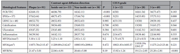 섬유피막의 파열 (p=0.032), inside-out 조영제 확산 패턴 (p=0.002), IPN grade 3은 유증상군의 CEUS에서 더 많이 관찰되었다. 특히 IPN grade 3은 허혈 사건과의 연관성이 가장 높았다. (OR=3.39) CEUS에서 관찰되는 inside-out 조영제 확산 패턴은 병리학적 섬유피막의 파열과 플라크 내부 출혈 소견과 높은 상관 관계를 보였다. IPN grade가 높아짐에 따라 미세혈관밀도(MVD), 미세혈관비율 (MVR), 플라크 내 출혈(IPH)의 병리적 특징이 더 많이 동반되었다. (p<0.001)