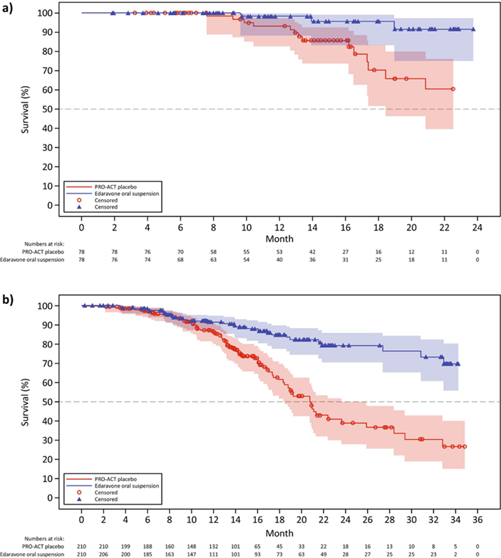 사전지정분석에서 Edaravone 복합 복용군(On/Off dosing regimen + 매일복용)이 대조군에 비해 사망 환자가 적고 (3.8% vs. 17.9%) 생존기간에서 통계적으로 유의한 차이를 보였다. 사후분석에서도 시험군에서 사망자가 적고 (13.8% vs 32.9%), 7.3개월정도 생존을 연장하는 결과를 보였다.