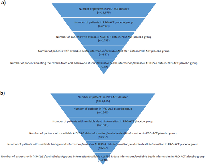 Edaravone 임상연구인 MT-1186-A01/A02/A03/A04 연구에서 Edaravone을 복용한 환자들을 시험군으로 하였다. ALS 임상시험 자료가 모여있는 PRO-ACT database에서 신약의 시험군으로 포함되지 않았던 환자를 외부 대조군으로 하였다(그림1). 10개의 변수를 1:1로 매칭하는 성향점수 매칭방법으로 외부 대조군을 최종적으로 정하였다.