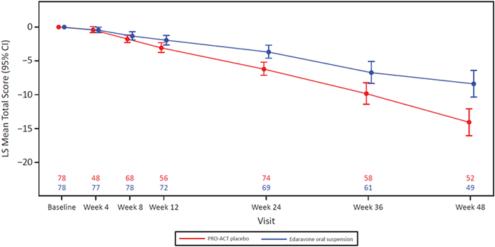 Edaravone 정맥주사는 ALS환자의 기능감소속도를 33% 줄인다는 결과를 토대로 2017년 FDA 승인을 받았다. 경구용 edaravone은 2022년 FDA승인을 받았다. MT-1186-A01연구를 통해 48주간 On/Off dosing regimen의 안정성과 내약성을 확인하였고, MT-1186-A03 연구를 통해 기간을 96주간 연장하여 장기간 사용에도 안전성에 문제가 없음을 확인하였다. MT-1186-A02 연구에서는 매일복용하는 것이 On/Off dosing regimen보다 우월함을 보였고, MT-1186-A04 연구는 좀 더 기간을 늘여서 시행하였다. 하지만 장기간 사용시 Edaravone의 효과를 보여주는 연구는 아직 없다.