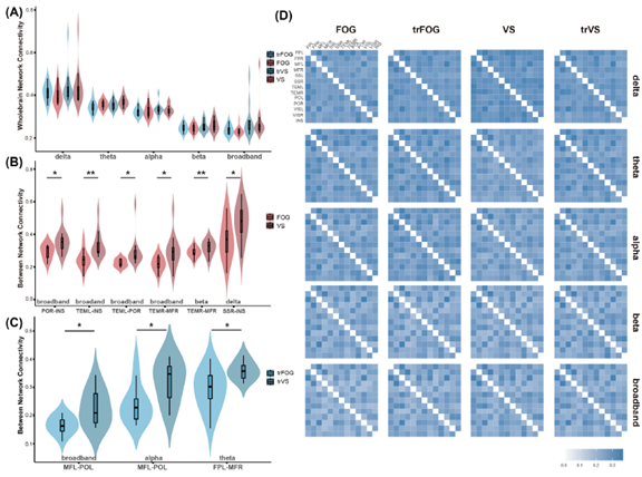 FOG 직전(trFOG)에서는 우측 fronto-parietal, middle frontal, parieto-occipital, visual network 및